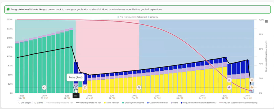 For example in a meeting we can show a client, there and then, what changing a planned retirement age from 65 to 60 can do to their pension income when they are 80, or what amount of increased pension contribution is required now to meet their target annual income when they have retired.